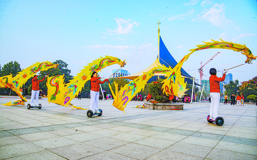 10月15日,黨的二十大開幕前夕,在鄆城風帆廣場,山東華龍健身俱樂部的健身愛好者們滿懷激情舞起“彩帶龍”,展示幸福生活,慶祝盛會召開。通訊員 王忠憲 攝