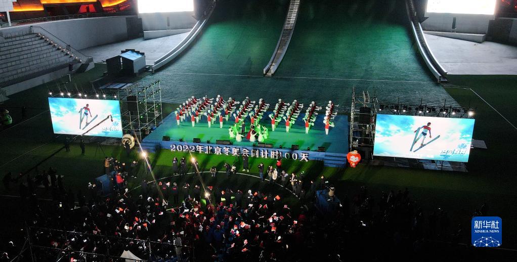 10月26日,“來自崇禮的邀約”——北京2022年冬奧會倒計時100天慶祝活動在河北省張家口市崇禮區(qū)國家跳臺滑雪中心“雪如意”舉行(無人機照片)。新華社記者 金皓原 攝