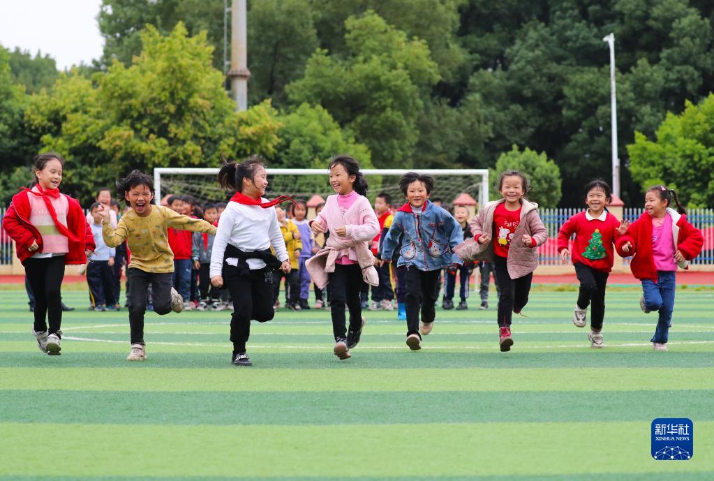 11月4日,在湖南省永州市新田縣雙碧小學,孩子們在運動場上做游戲。今年秋季學期開學以來,各地積極落實“雙減”政策,利用課后服務時間開展內容豐富、形式多樣的課外活動,促進學生全面發展。新華社發(劉貴雄攝)