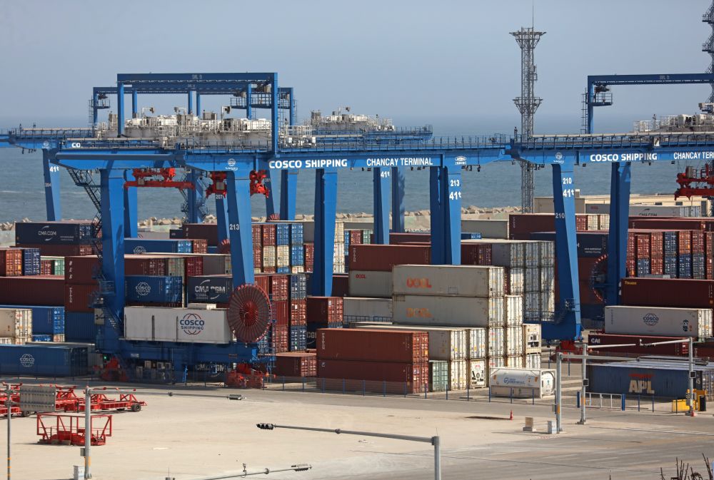 這是2025年10月7日拍攝的秘魯錢凱港碼頭擺放的集裝箱。位于秘魯首都利馬以北約80公里的錢凱港于2024年11月正式開港,標志著中秘共建“一帶一路”取得新的重要成果。新華社發(瑪麗安娜·巴索 攝)