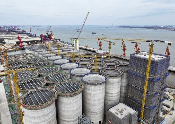 在江蘇省靖江市拍攝的中糧靖江碼頭倉儲物流項目建設現場(2025年2月20日攝,無人機照片)。新華社發(顧繼紅攝)