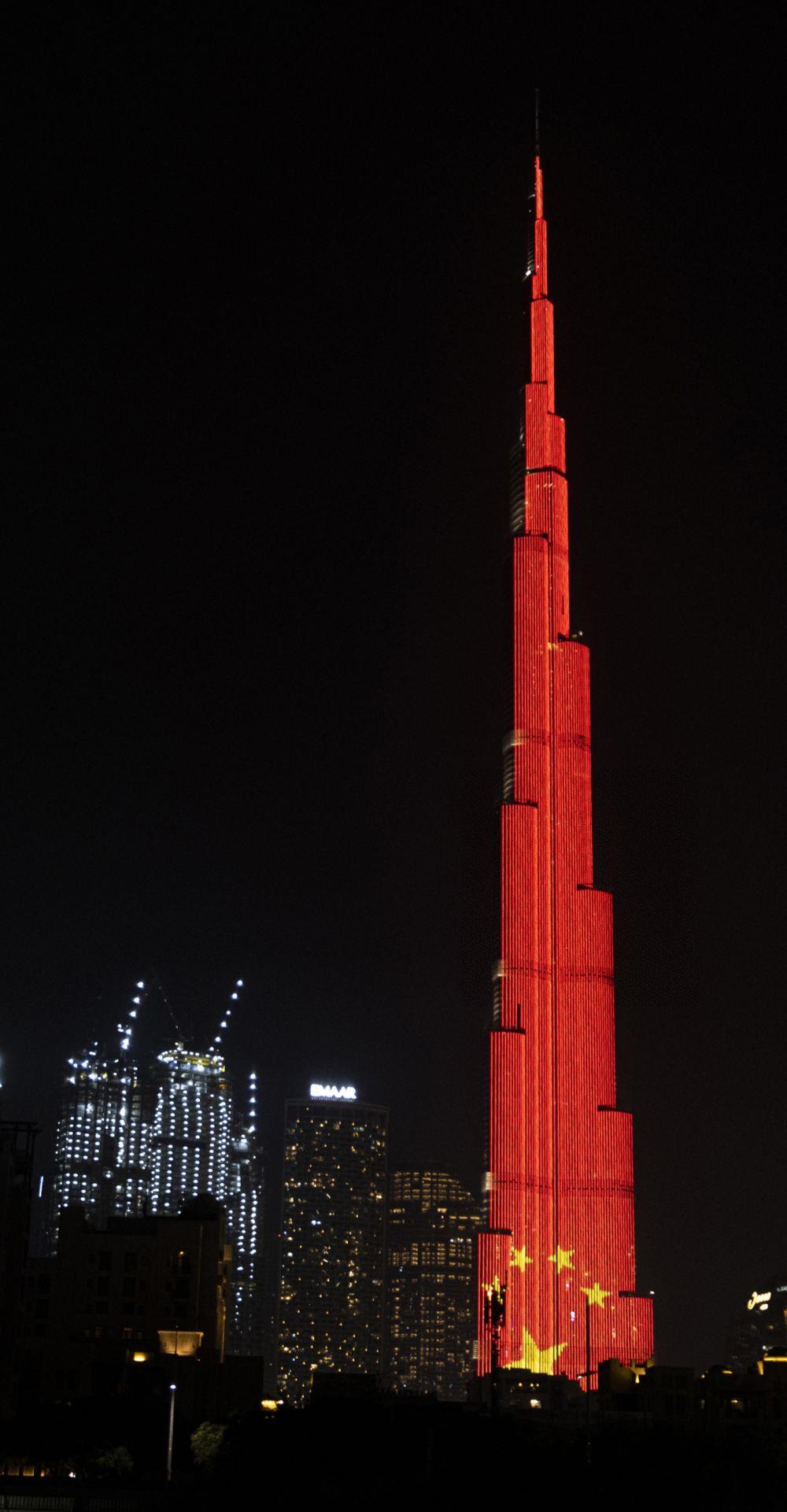 △當?shù)貢r間2020年2月2日,在阿聯(lián)酋迪拜,當?shù)氐貥私ㄖ锕ㄋc亮中國國旗圖案,為中國抗擊新冠肺炎疫情加油。