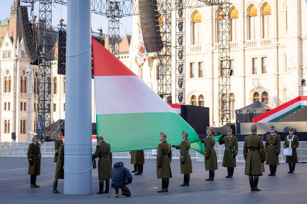這是3月15日在匈牙利布達佩斯國會大廈前的科蘇特廣場拍攝的民族節升旗儀式現場。新華社發(鮑拉日·塞凱伊希迪攝)