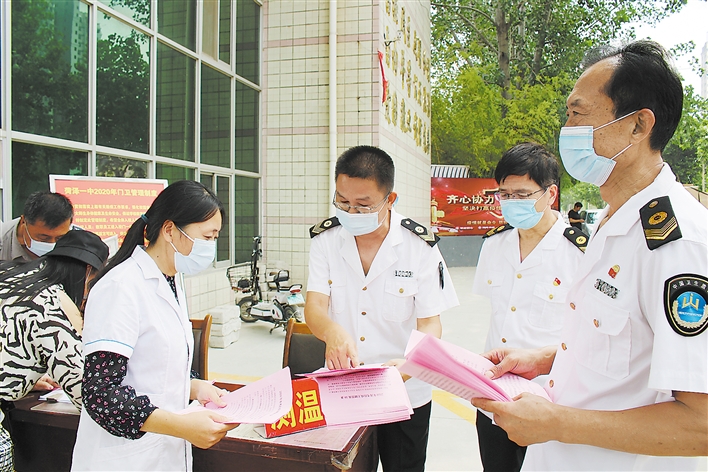 6月30日,市衛生健康綜合執法支隊的執法人員正在菏澤一中校門口宣傳《2020年高考防疫關鍵措施10條》。據了解,為落實好這10項措施,助力我市高考工作,喜迎“七 一”建黨節,當天,市衛生健康綜合執法支隊開展黨員主題日活動,20余名黨員干部分成三組分赴定陶區、牡丹區、市開發區,在相關學校門口,對照高考防疫10條措施,指導學校負責人和過往群眾、學生家長等做好高考防疫工作,確保我市考生順利高考。