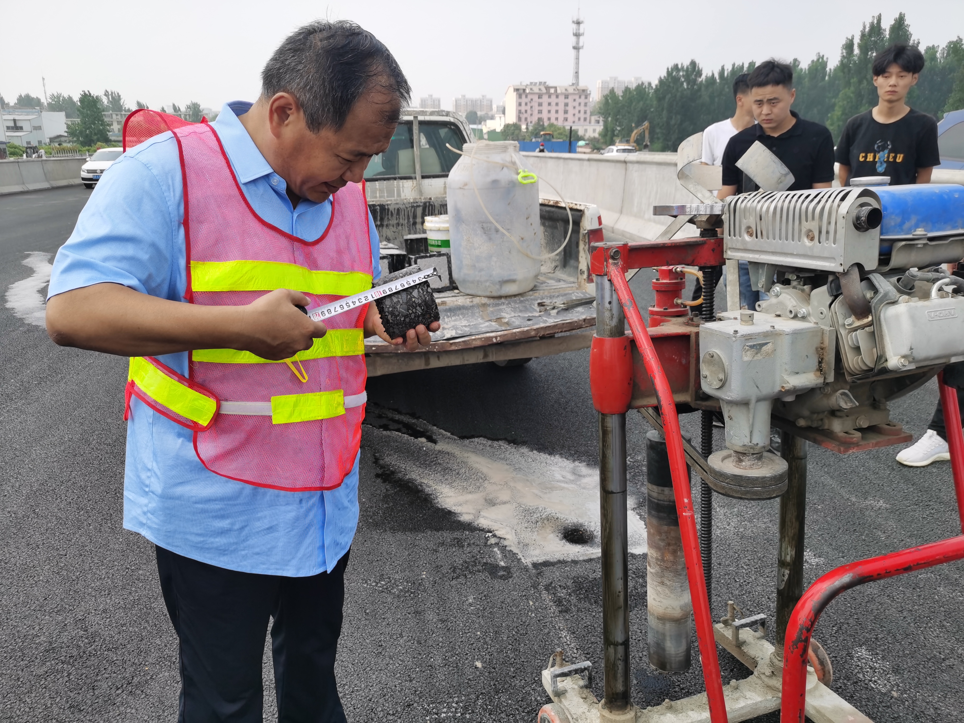7月15日,市公路事業發展中心工程科副科長劉健頂著烈日來到人民路南外環互通立交橋施工現場,進行取芯檢測后,又帶著水泥抽樣來到市公路事業發展中心實驗室,做水泥膠砂強度試驗,檢查原材料是否合格。