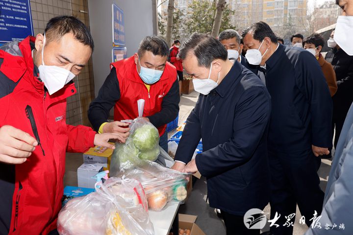 離華實小區不遠的盛泉小區,因疫情防控需要目前實行封閉管理。社區居民生活是否有保障?李干杰對此十分關心。他來到小區封控入口處,察看新鮮配送的一批水果蔬菜。社區負責人介紹,小區封控后,糧油肉蛋奶果蔬等生活必需品由廠家直供,居民線上點單,廠家線下配貨,再由社區有序分發給居民。李干杰說,封控、管控小區要把服務保障工作做得再細致周到一些,確保生活物資供應充足的同時,及時幫助解決群眾日常生活遇到的就醫用藥等實際問題。