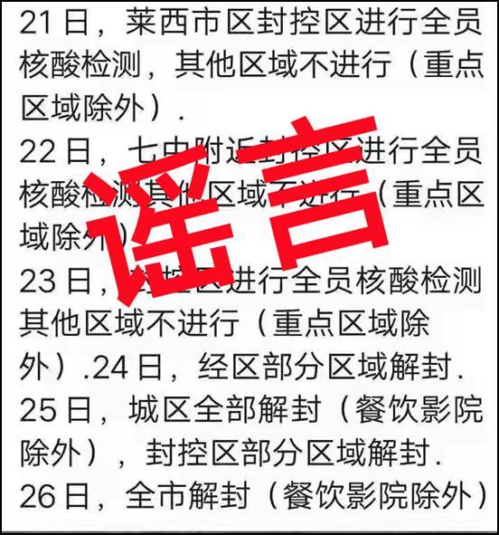辟謠 | 網傳“萊西市封控區核酸檢測及城區解封”等信息不屬實