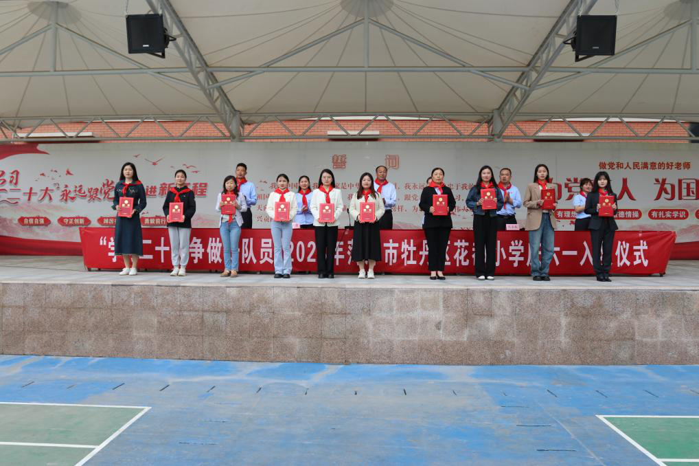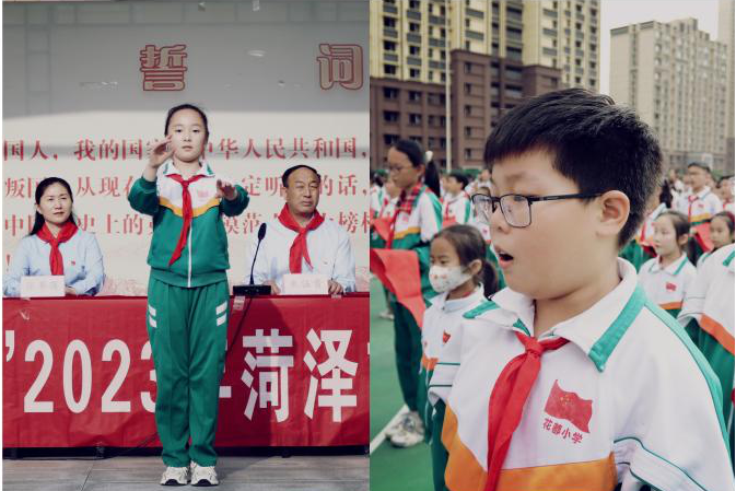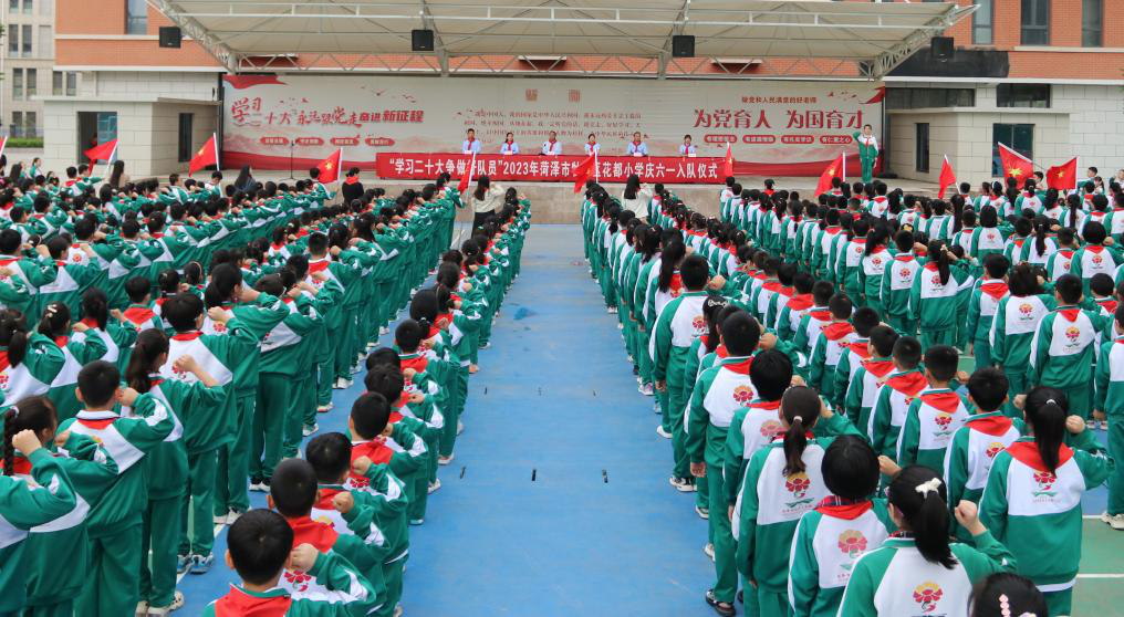 牡丹區花都小學副校長張翠蓮宣讀了300新隊員名單。優秀少先隊員代表為新隊員們佩戴象征著光榮和使命的紅領巾。新隊員們激動不已,小心撫摸著這份系在胸前的榮譽。紅色薪火,代代相傳,這是一份榮耀的傳遞,更是一份責任的囑托!