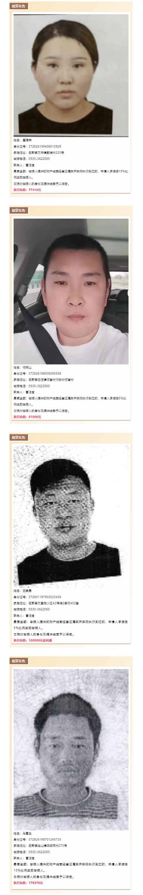 自發布之日起至案件執行結止,凡公民、法人或其他組織能夠舉報被執行人轉移、隱匿財產線索或提供被執行人下落,并使案件得以執行的,按懸賞金額給予獎勵。本院對舉報人的身份及提供線索予以保密。