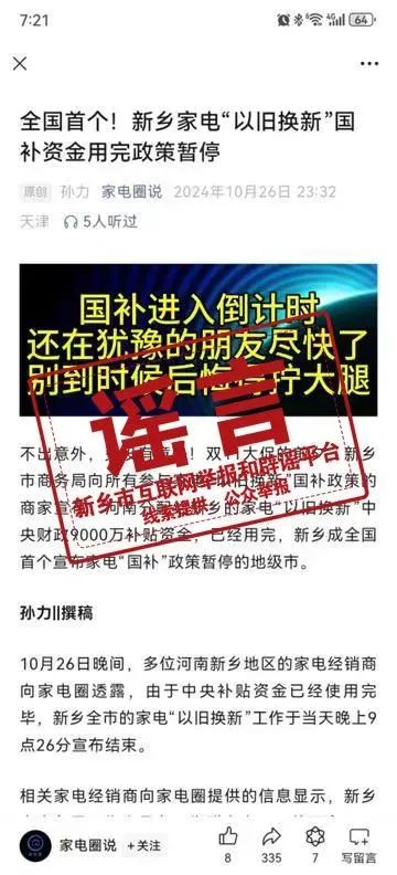10月26日,有網民在多平臺發布關于“全國首個!河南新鄉家電以舊換新國補資金用完政策暫停”的文章,聲稱“國補末班車即將結束”“中央財政9000萬補貼資金已經用完”等內容。經查,該信息系謠言。