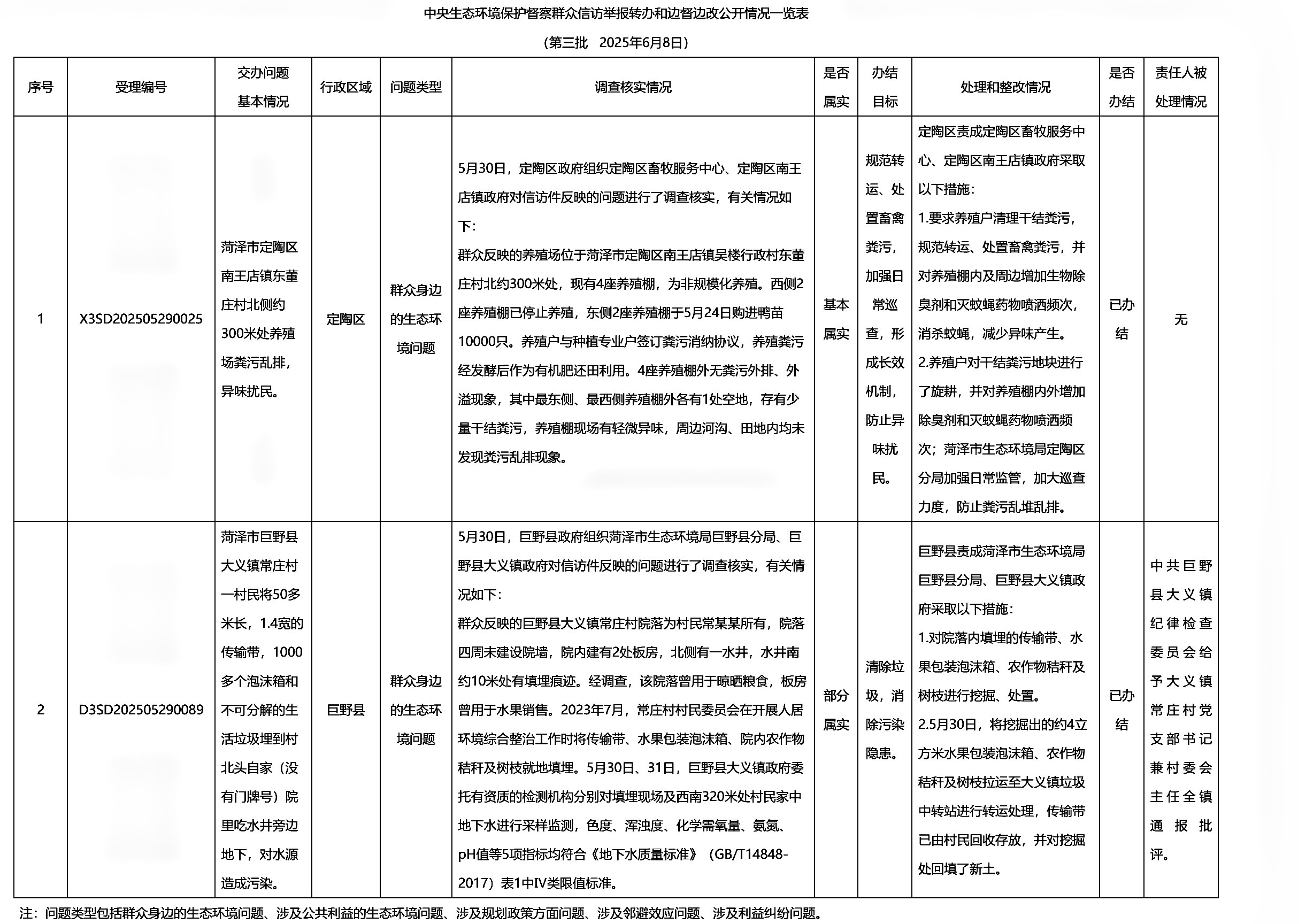 截至6月8日,中央第三生態環境保護督察組轉辦我市的第三批2件信訪件,已辦結2件。其中,問責1人。根據督察要求,現予以公開。